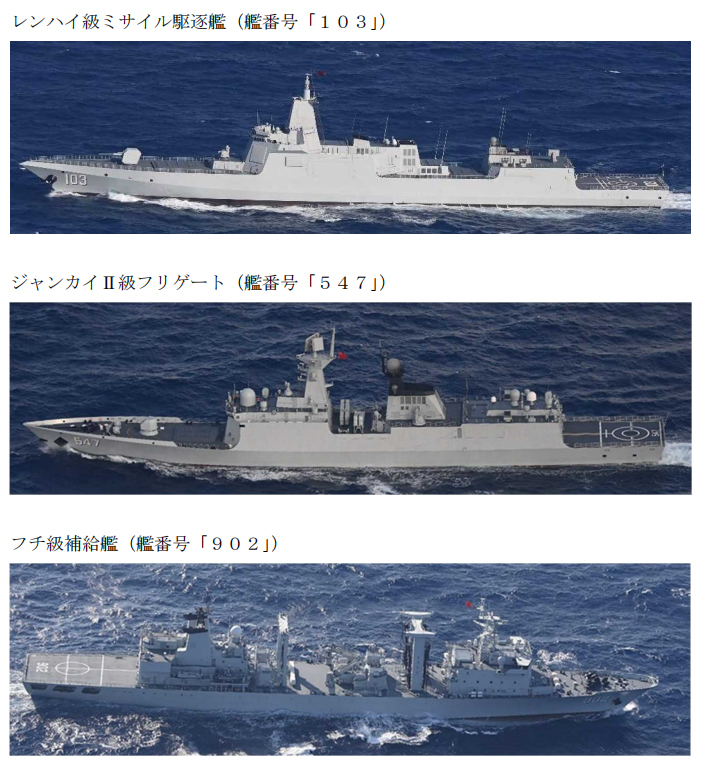 日本自卫队拍摄到的鞍山舰、临沂舰和东平湖舰。日本防卫省统合幕僚监部